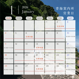 【青海観光案内所冬季休業のお知らせ(令和7年度)】 休業日・営業日はカレンダーでご確認ください。