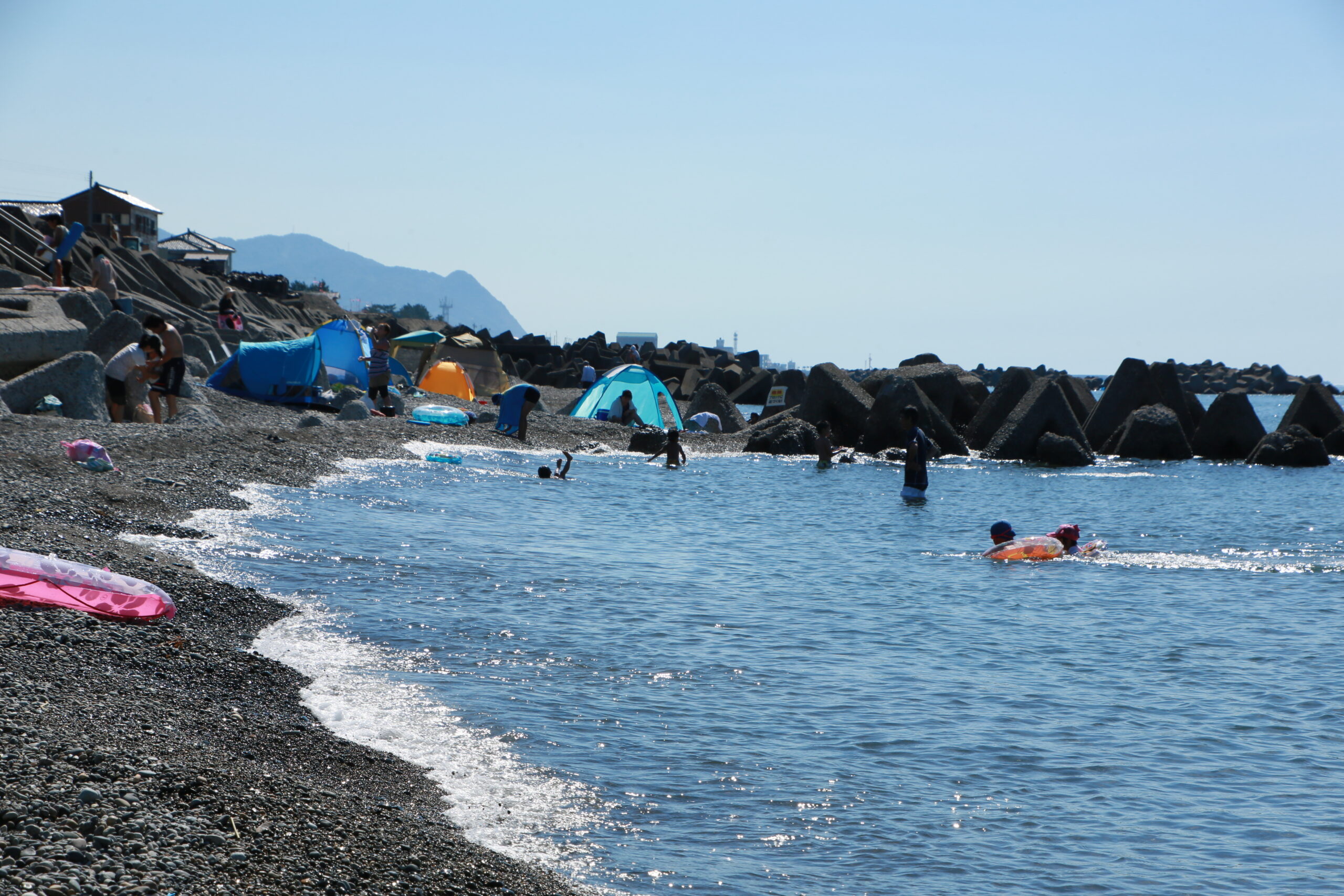 小砂利まじりの大和川海水浴場は、波も静かで透明度も高く、知る人ぞ知る隠れた人気スポット。(※バーベキューの利用可、ごみ持ち帰り厳守)