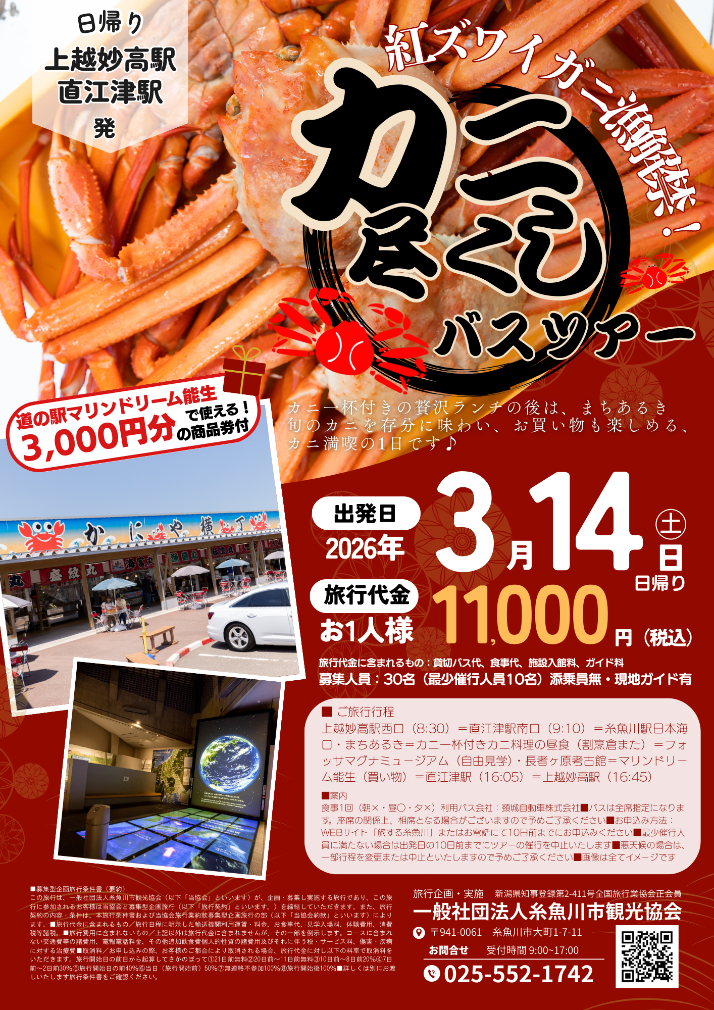 行程:上越妙高駅西口(8:30)=直江津駅南口(9:10)=糸魚川駅日本海口・まちあるき=カニ一杯付きカニ料理の昼食(割烹倉また)=フォッサマグナミュージアム(自由見学)・長者ヶ原考古館=マリンドリーム能生(買い物)=直江津駅(16:05)=上越妙高駅(16:45)