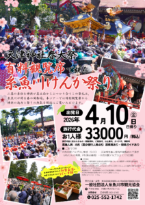 行程:糸魚川駅アルプス口集合(9:00)→天津神社春大祭観覧席にて見学(午前中は神輿のぶつかり合い、午後は国の重要民俗文化財指定舞楽奉納)→糸魚川駅アルプス口解散(17:00頃)
